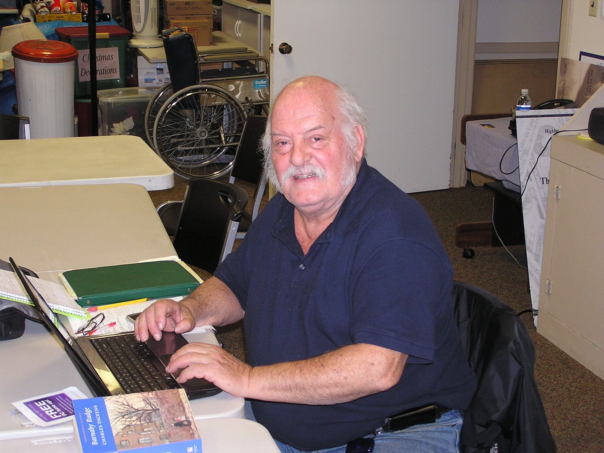 This month wed like to give thanks to someone who helps to keep this place running and in tip-top shape. Marty Martinez is our Handyman/Jack-of-all-trades. He comes in several days week to help spruce up the place. He vacuums, takes out the trash...but he does much more than just clean. When we have something that needs taken care of or fixin hes our go-to-guy. Hes started volunteering here just after joining the center. He has known Penny Lilburn for a long time and Annette Mendenhall for even longer so he had known about the center. He had just sold his business, the Green Frog Bar, which he owned for 12 years. He was looking for something to keep him busy. (Or maybe his wife was looking for something to keep him busy). If you know Penny or Annette, then you know these two can always find something for a volunteer to do, and hes been doing it ever since. Originally from Fresno, CA, he spent 30 years in Air force. His last 17 were at Norton, where he retired from that job as a Loadmaster. He and wife Judith decided to stay in the area where they have raised two kids, 5 grandkids, 1 great-grand kid. Thanks for lending us a helping hand.